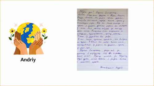 在我们城市里,感谢上帝,一切都还平静。但我们的家仍然在经历战争。我爸爸已经失踪三年了, 一直音讯全无。妈妈和我每天都在祈祷,希望爸爸能平安归来。我非常想念他,总是问妈妈关于他的事情。亲爱的捐助人,我请求您也为我的爸爸祈祷。我们全家都很伤心。